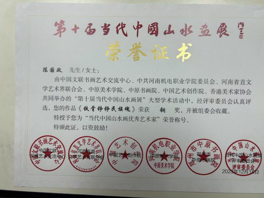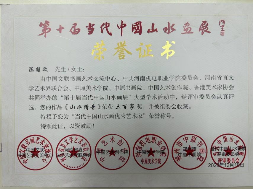 陈国政现为中原书画院副秘书长、中原美术学院特聘教授,河南省美术家协会会员、河南省花鸟书画院研究员、大河文化艺术书画院副院长、金水区美术家协会副主席、中国国家画院研究生。