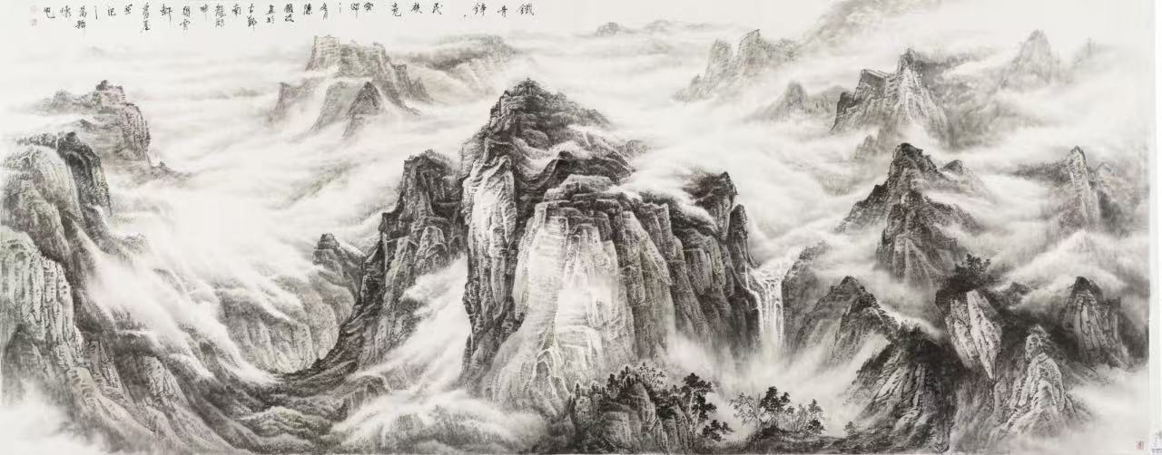 从他的作品中,我们能清晰洞察到其对传统山水画技法的深刻领悟与创新运用。观其画作,构图精妙,布局严谨却不失灵动。以《铁骨铮铮民族魂》为例,巍峨山峦在云雾中若隐若现,运用浓淡相宜的墨色,将山石的坚硬质感与云雾的缥缈轻盈完美融合,展现出一种雄浑壮阔的气势。这种对画面节奏与韵律的精准把握,正是传统山水画“经营位置”这一法则的生动体现,却又融入了他个人对山水精神的独特理解。
